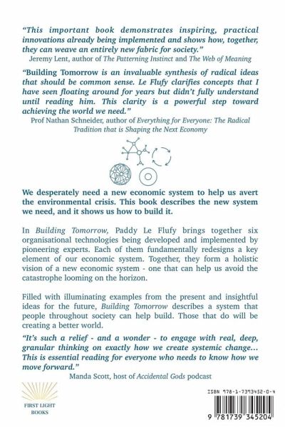 *A Financial Times best summer book of 2023* ¿'This book will shift the Overton Window to the regenerative space' Brave New Europe review We desperately need a new economic system to help us avert the environmental crisis. This book describes the new system we need, and it shows us how to build it. In Building Tomorrow, Paddy Le Flufy brings together six organisational technologies being developed and implemented by pioneering experts. Each of them fundamentally redesigns a key element of our economic system. Together, they can transform it into a new system - one that can help us avoid the catastrophe looming on the horizon. The book aims directly at creating systemic change by providing people with both a holistic vision of a new economic system and the tools with which to build it. The majority of the writing is about positive real-world examples and potential future developments, which show how people throughout society (such as the readers) can themselves help build the new system. Those that do will be creating a better world. 'It's such a relief - and a wonder - to engage with real, deep, granular thinking on exactly how we create systemic change... Essential reading' Manda Scott, author and host of the Accidental Gods podcast