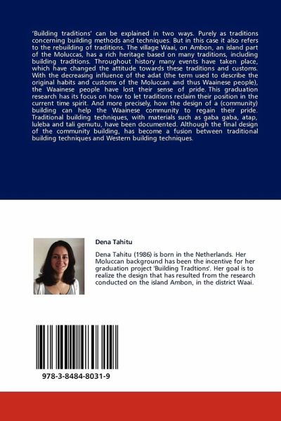 Building traditions can be explained in two ways. Purely as traditions concerning building methods and techniques. But in this case it also refers to the rebuilding of traditions. The village Waai, on Ambon, an island part of the Moluccas, has a rich heritage based on many traditions, including building traditions. Throughout history many events have taken place, which have changed the attitude towards these traditions and customs. With the decreasing influence of the adat (the term used to describe the original habits and customs of the Moluccan and thus Waainese people), the Waainese people have lost their sense of pride. This graduation research has its focus on how to let traditions reclaim their position in the current time spirit. And more precisely, how the design of a (community) building can help the Waainese community to regain their pride. Traditional building techniques, with materials such as gaba gaba, atap, luleba and tali gemutu, have been documented. Although thefinal design of the community building, has become a fusion between traditional building techniques and Western building techniques.