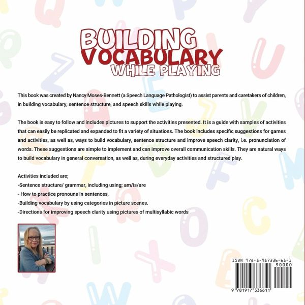 This book was created by Nancy Moses-Bennett (a Speech Language Pathologist) to assist parents and caretakers of children, in building vocabulary, sentence structure, and speech skills while playing. The book is easy to follow and includes pictures to support the activities presented. It is a guide with samples of activities that can easily be replicated and expanded to fit a variety of situations. The book includes specific suggestions for games and activities, as well as, ways to build vocabulary, sentence structure and improve speech clarity, i.e. pronunciation of words. These suggestions are simple to implement and can improve overall communication skills. They are natural ways to build vocabulary in general conversation, as well as, during everyday activities and structured play. Activities included are; -Sentence structure/ grammar, including using; am/is/are - How to practice pronouns in sentences, -Building vocabulary by using categories in picture scenes. -Directions for improving speech clarity using pictures of multisyllabic words.