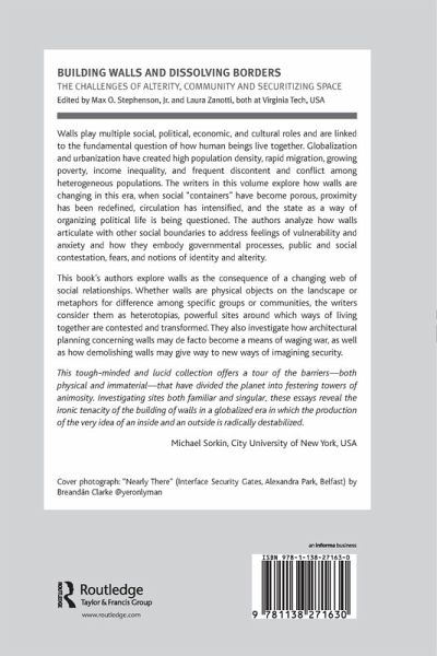 Introduction Building Walls Unmaking Borders: the Securitization of Space and the Making of Community Imagination Max O. StephensonJr. Laura Zanotti; Part I Walling Spaces Making Identity; Chapter 1 Bordering Violence? Natality and Alterity in Hannah Arendt's Thought Alexander D. Barder François Debrix; Chapter 2 Bamboo Walls: Military Dependents' Villages of Taiwan as Cultural Heterotopias Tsung Juang Wang; Chapter 3 Gates not Walls as a Securitization Strategy: Gated Communities and Market Rate Co-operatives in New York Setha Low Gregory T. Donovan Jen Jack Gieseking; Chapter 4 Tinkering with Space: Heterotopic Walls and the Privileged Imaginary of the "New Belfast" Scott Tate; Part II Enclosing a Porous World Securitizing the Movement of People; Chapter 5 Inside-Outside: The Making of the West Bank Security Wall M. Alaa Mandour; Chapter 6 Design as Defense: Broken Barriers and the Security Spectacle at the US-Mexico Border Timothy W. Luke; Chapter 7 1This study was conducted before the 2010 earthquake and therefore does not take into account new forms of spatialization that may have occurred as a result of that event. Marsha Henry Paul Higate; Part III Walls and the Hybridization of Memory; Chapter 8 Reading Trails and Inscriptions Around an Old Bus-house in Monarga North Cyprus Yonca Hurol Guita Farivarsadri; Chapter 9 Cultural Memory after the Fall of the Berlin Wall: The Case of Checkpoint Charlie Carolyn Loeb Andreas Luescher; Part IV Conclusions; conclusion Conclusions;