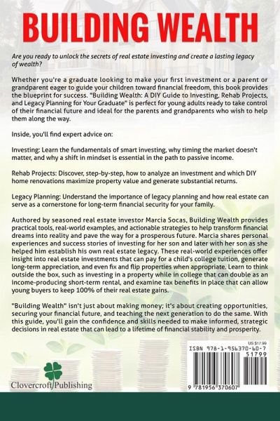 Ready to unlock the secrets of real estate investing and create a lasting legacy of wealth? Building Wealth: A DIY Guide to Investing, Rehab Projects, and Legacy Planning for Your Graduate is perfect for young adults ready to take control of their financial future and ideal for the parents and grandparents eager to guide them. Inside, you'll find expert advice on: * Investing: Learn the fundamentals of smart investing, why timing the market doesn't matter, and the mindset shift essential for passive income. * Rehab Projects: Discover how to analyze an investment and maximize value with DIY renovations. * Legacy Planning: Understand how real estate can secure long-term generational wealth. Authored by seasoned investor Marcia Socas, Building Wealth provides practical tools and actionable strategies relayed through personal stories of investing for, and with, her son. These offer insight into real estate investments that pay for college tuition, generate long-term appreciation, create successful fix and flips, become income-producing short-term rentals while in college, and strategies that can allow young buyers to keep 100% of their gains. Building Wealth isn't just about making money; it's about creating opportunities and securing financial futures for generations to come.
