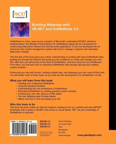 A practical guide to creating and maintaining your own website with DotNetNuke, the free, open source evolution of Microsoft's celebrated IBuySpy portal. DotNetNuke is the leading open source website system for .NET. This book shows you how to get a fully featured website right off the blocks, with forums, news and image management, visitor accounts and registration, and community contribution features. The book then takes VB.NET developers through extending and customizing this powerful application. Featuring coverage of skins, custom modules, forums, extensions and add-ons. The book is useful for all DotNetNuke users, administrators, and designers as well as experienced VB.NET developers.