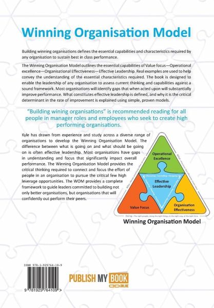 Building winning organisations defines the essential capabilities and characteristics required by any organisation seeking to sustain best in class performance. The Winning Organisation Model outlines the four capabilities of Value focus- Operational excellence - Organisational Effectiveness -Effective Leadership. Each capability has essential characteristics that describe how Winning Organisations operate. Real examples are provided to help build understanding. The book is designed to enable any organisation to assess its current capabilities and thinking, to quickly identify gaps where improvement is required to achieve to best in class performance. Effective leadership is explored in detail. Why effective leadership is a critical determinant in the rate of performance improvement is explained and simple models that have been proven in practice are provided. The Winning Organisation Model is recommended for employees seeking to improve the way that their organisation works. The Winning Organisation Model allows leaders to cost effectively understand what is required to sustain better, faster, cheaper performance than the competition.
