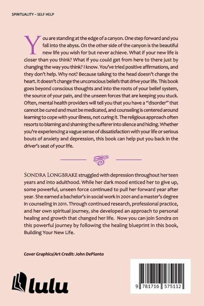 You are standing at the edge of a canyon. One step forward and you fall into the abyss. On the other side of the canyon is the beautiful new life you wish for but never achieve. What if your new life is closer than you think? What if you could get from here to there just by changing the way you think? I know. You've tried positive affirmations, and they don't help. Why not? Because talking to the head doesn't change what you believe in your heart. It doesn't change the unconscious beliefs that drive your life. This book goes beyond conscious thoughts and into the roots of your belief system, the source of your pain, and the unseen forces that are keeping you stuck. Often, mental health providers will tell you that you have a "disorder" that cannot be cured and must be medicated, and counseling is centered around learning to cope with your "illness", not curing it. The religious approach often resorts to blaming and shaming the sufferer into silence and hiding their problems. Whether you're experiencing a vague sense of dissatisfaction with your life or serious bouts of anxiety and depression that seem to cripple you, this book can teach you how to experience joy and put you back in the driver's seat of your life.