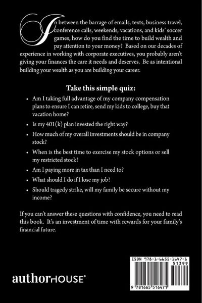 In between the barrage of emails, texts, business travel, conference calls, weekends, vacations, and kids' soccer games, how do you find the time to build wealth and pay attention to your money? Based on our decades of experience in working with corporate executives, you probably aren't giving your finances the care it needs and deserves. Be as intentional building your wealth as you are building your career. Take this simple quiz: - Am I taking full advantage of my company compensation plans to ensure I can retire, send my kids to college, buy that vacation home? - Is my 401(k) plan invested the right way? - How much of my overall investments should be in company stock? - When is the best time to exercise my stock options or sell my restricted stock? - Am I paying more in tax than I need to? - What should I do if I lose my job? - Should tragedy strike, will my family be secure without my income? If you can't answer these questions with confidence, you need to read this book. It's an investment of time with rewards for your family's financial future.