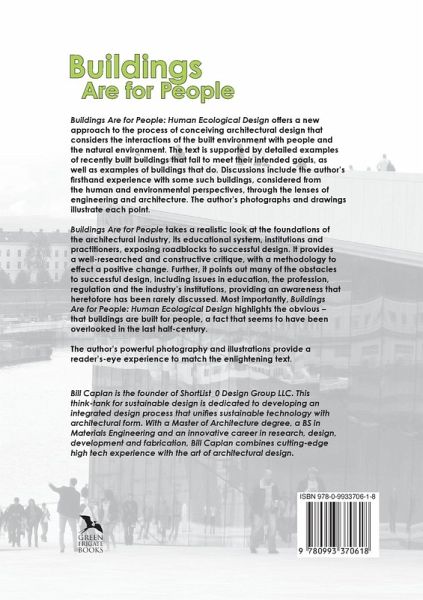 Buildings are for People: Human Ecological Design offers a new approach to the process of conceiving architectural design, one that considers the interactions of the built environment with people and the natural environment. The book exposes our visceral and experiential connections to buildings, and how buildings intervene directly with our ecosystem, natural environment and sense of place. It brings to light our ability to utilize a building's surfaces, shape and materiality to synergize with the energy and forces of nature for a more green and sustainable architecture. It points out many of the roadblocks to successful design including issues in education, the profession, regulation and the industry's institutions, providing an awareness that heretofore is rarely discussed. Most importantly, Buildings are for People: Human Ecological Design highlights the obvious, that buildings are built for people, a fact that seems to have been overlooked in the last half-century.