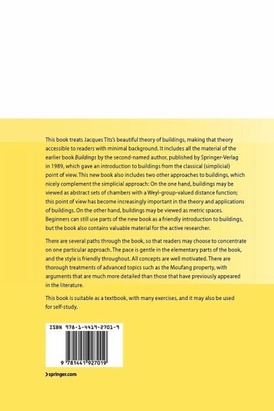 This text started out as a revised version of Buildings by the second-named author [53], but it has grown into a much more voluminous book. The earlier book was intended to give a short, friendly, elementary introduction to theory, accessible to readers with a minimal background.Moreover, it approached buildings from only one point of view, sometimes called the "old-fashioned" approach: A building is a simplicial complex with certain properties. The current book includes all the material of the earlier one, but we have added a lot. In particular, we have included the "modern" (or "W-metric") approach to buildings, which looks quite different from the old-fashioned approach but is equivalent to it. This has become increasingly important in the theory and applications of buildings. We have also added a thorough treatment of the Moufang property, which occupies two chapters. And we have added many new exercises and illustrations. Some of the exercises have hints or solutions in the back of the book. A more extensive set of solutions is available in a separate solutions manual, which may be obtained from Springer's Mathematics Editorial Department. We have tried to add the new material in such a way that readers who are content with the old-fashioned approach can still get an elementary treatment of it by reading selected chapters or sections. In particular, many readers will want to omit the optional sections (marked with a star). The introduction below provides more detailed guidance to the reader.