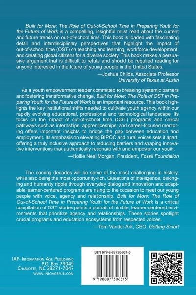 Built for More, The Role of OST in Preparing Youth for the Future of Work will highlight OST research and illustrative practices and bring forward multi-disciplinary perspectives about future trends, innovations, and the impact of OST on the future workforce. The focus is on OST programs as well as related activities that contribute to employability, such as summer work, internships, apprenticeships, disability inclusion, career-focused mentoring, and more. The book will also lift up voices traditionally left out of the OST conversation, including BIPOC, rural, and other marginalized communities.Given that the world of work is rapidly evolving, what are the most important ways we should be framing education and youth development work? Define forces and illuminate the trends reshaping the necessary skills that youth will need to thrive professionally, personally, and to positively impact their communities. What are the skills that employers are saying are most valuable due to transformation from automation, machine learning, and the 4th industrial age we are experiencing globally? What are key demographic shifts that add urgency to the imperative for change in our human development ecosystems?