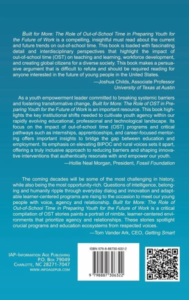 Built for More, The Role of OST in Preparing Youth for the Future of Work will highlight OST research and illustrative practices and bring forward multi-disciplinary perspectives about future trends, innovations, and the impact of OST on the future workforce. The focus is on OST programs as well as related activities that contribute to employability, such as summer work, internships, apprenticeships, disability inclusion, career-focused mentoring, and more. The book will also lift up voices traditionally left out of the OST conversation, including BIPOC, rural, and other marginalized communities.Given that the world of work is rapidly evolving, what are the most important ways we should be framing education and youth development work? Define forces and illuminate the trends reshaping the necessary skills that youth will need to thrive professionally, personally, and to positively impact their communities. What are the skills that employers are saying are most valuable due to transformation from automation, machine learning, and the 4th industrial age we are experiencing globally? What are key demographic shifts that add urgency to the imperative for change in our human development ecosystems?