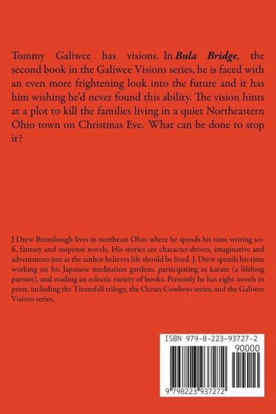 Tommy Galiwee has visions. In Bula Bridge, the second book in the Galiwee Visions series, he is faced with an even more frightening look into the future and it has him wishing he'd never found this ability. The vision hints at a plot to kill the families living in a quiet Northeastern Ohio town on Christmas Eve. What can be done to stop it? (Approximately 245 pages)
