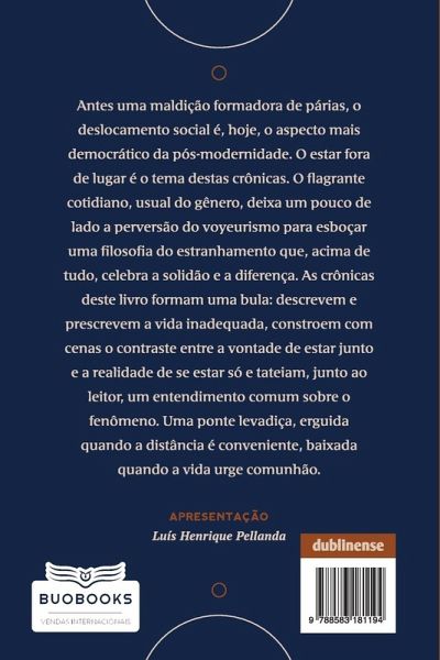 Antes uma maldição formadora de párias, o deslocamento social é, hoje, o aspecto mais democrático da pós-modernidade. O estar fora de lugar é o tema destas crônicas. O flagrante cotidiano, usual do gênero, deixa um pouco de lado a perversão do voyeurismo para esboçar uma filosofia do estranhamento que, acima de tudo, celebra a solidão e a diferença. As crônicas deste livro formam uma bula: descrevem e prescrevem a vida inadequada, constroem com cenas o contraste entre a vontade de estar junto e a realidade de se estar só e tateiam, junto ao leitor, um entendimento comum sobre o fenômeno. Uma ponte levadiça, erguida quando a distância é conveniente, baixada quando a vida urge comunhão.