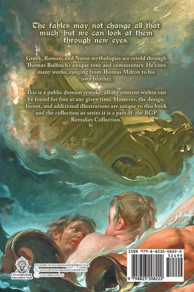 The fables may not change all that much, but we can look at them through new eyes. Greek, Roman, and Norse mythologies are retold through Thomas Bulfinch's unique tone and commentary. He cites many works, ranging from Thomas Milton to his own brother. This is a public domain remake; all the content within can be found for free at any given time. However, the design, layout, and additional illustrations are unique to this book and the collection or series it is a part of: the BGP Remakes Collection.