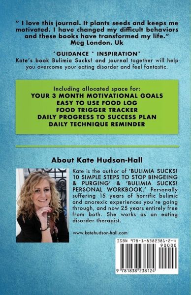 Your personal food journal is approximately A5 in size, lightweight. Giving you the guidance and inspiration to help in your recovery to overcome your eating disorder. Including: 3 MONTH MOTIVATIONAL GOALS: Allocated space to set inspiring, achievable goals. EASY TO USE FOOD LOG: Undated, 3-month food diary, with assigned spaces to record your food eaten. Daily goals, water intake and your 5 a day! FOOD TRIGGER TRACKER: Keeping track of your triggers, thoughts and feelings is a key to changing your behaviors. DAILY PROGRESS TO SUCCESS PLAN: By listing your daily successes, you can incorporate them into the next day to help keep you focused and inspired. DAILY TECHNIQUE REMINDER: List what empowering techniques to use to begin to unlock your secrets to bulimia freedom. Kate Hudson-Hall is also the author of 'BULIMIA SUCKS! 10 SIMPLE STEPS TO STOP BINGEING & PURGING' & 'BULIMIA SUCKS! PERSONAL WORKBOOK.' Personally suffering 15 years of horrific bulimic and anorexic experiences you're going through, and now 25 years entirely free from both. 21 years ago, she trained as a psychotherapist and eating disorder therapist. She has been helping clients overcome their Bulimia COMPLETELY ever since. Check out my other books for further help in your recovery.