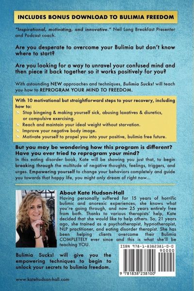 Are you sick of your bulimia? Do you want to learn how to stop your compulsive behaviors once and for all? If YES is your answer, fantastic, then Bulimia Sucks! is exactly what you've been looking for. In this eating disorders book, Kate will show you the same way she helps her clients begin their recovery with the Bulimia Sucks! Program. Taking you from sick to freedom! Personally suffering 15 years of horrific bulimic and anorexic experiences you're going through, and now 25 years entirely free from anorexia and bulimia. Thanks to various therapist's help, Kate decided that she would like to help others. So, 21 years ago, she trained as a psychotherapist, hypnotherapist, and NLP practitioner. Kate then continued to train in many other therapy areas, one being an eating disorder therapist. Helping clients overcome their bulimia completely, and this is what she'll be teaching you. You may be wondering how this program is different? Well, have you ever tried to reprogram your mind before? In Bulimia Sucks! You will learn astounding new approaches to reprogram your mind and discover how to: ¿ Stop bingeing & making yourself sick, abusing laxatives, diuretics & compulsive exercising. ¿ Breakthrough your negative thoughts, feelings, triggers and urges. ¿ Improve your negative body image & reach and maintain your ideal weight without starvation. ¿ Stay motivated to propel you into your bulimia free future. Do you want to be like Nicola? She says, "I'm eating three meals a day (!!!!) with snacks between. I'm not taking any substances and only having the occasional glass of wine. The bulimia is fading away and only appears its ugly head when I am anxious, which is rare." If the answer is yes? Then now is the time to grab your copy... Read this book NOW... Bulimia Sucks! will give you the empowering techniques to begin to unlock your secrets to bulimia freedom. INCLUDES BONUS DOWNLOAD TO BULIMIA FREEDOM