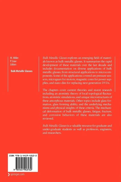 A complete overview of bulk metallic glasses is presented: the principles of alloy design, glass formation, processing, atomistic modeling, computer simulations, mechanical properties and microstructures.