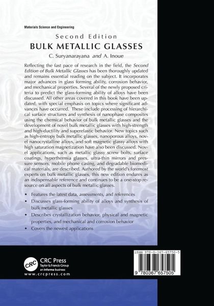 Reflecting the fast pace of research in the field, the Second Edition of Bulk Metallic Glasses has been thoroughly updated and remains essential reading on the subject. It incorporates major advances in glass forming ability, corrosion behavior, and mechanical properties. Several of the newly proposed criteria to predict the glass-forming ability of alloys have been discussed. All other areas covered in this book have been updated, with special emphasis on topics where significant advances have occurred. These include processing of hierarchical surface structures and synthesis of nanophase composites using the chemical behavior of bulk metallic glasses and the development of novel bulk metallic glasses with high-strength and high-ductility and superelastic behavior. New topics such as high-entropy bulk metallic glasses, nanoporous alloys, novel nanocrystalline alloys, and soft magnetic glassy alloys with high saturation magnetization have also been discussed. Novel applications, such as metallic glassy screw bolts, surface coatings, hyperthermia glasses, ultra-thin mirrors and pressure sensors, mobile phone casing, and degradable biomedical materials, are described. Authored by the world's foremost experts on bulk metallic glasses, this new edition endures as an indispensable reference and continues to be a one-stop resource on all aspects of bulk metallic glasses.