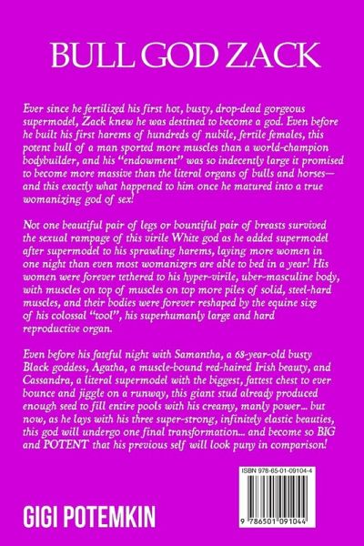Ever since he fertilized his first hot, busty, drop-dead gorgeous supermodel, Zack knew he was destined to become a god. Even before he built his first harems of hundreds of nubile, fertile females, this potent bull of a man sported more muscles than a world-champion bodybuilder, and his "endowment" was so indecently large it promised to become more massive than the literal organs of bulls and horses-and this exactly what happened to him once he matured into a true womanizing god of sex! Not one beautiful pair of legs or bountiful pair of breasts survived the sexual rampage of this virile White god as he added supermodel after supermodel to his sprawling harems, laying more women in one night than even most womanizers are able to bed in a year! His women were forever tethered to his hyper-virile, uber-masculine body, with muscles on top of muscles on top more piles of solid, steel-hard muscles, and their bodies were forever reshaped by the equine size of his colossal "tool", his superhumanly large and hard reproductive organ. Even before his fateful night with Samantha, a 68-year-old busty Black goddess, Agatha, a muscle-bound red-haired Irish beauty, and Cassandra, a literal supermodel with the biggest, fattest chest to ever bounce and jiggle on a runway, this giant stud already produced enough seed to fill entire pools with his creamy, manly power... but now, as he lays with his three super-strong, infinitely elastic beauties, this god will undergo one final transformation... and become so BIG and POTENT that his previous self will look puny in comparison!