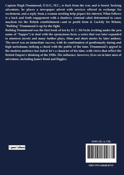 "Bulldog Drummond" by H. C. McNeile, published in 1920, is a classic mystery novel that follows the exploits of Hugh "Bulldog" Drummond, a former British officer who finds civilian life monotonous after World War I. Seeking excitement, Drummond places an advertisement in the newspaper, offering his services for any adventure. This leads him to a series of thrilling encounters involving espionage, crime, and intrigue. The novel begins with Drummond taking tea at the Carlton, where he is unexpectedly drawn into a web of danger. As the story unfolds, Drummond travels to various locations, including Godalming and Paris, encountering a cast of characters that include villains and allies alike. The narrative is structured around a series of escalating events, each chapter bringing new challenges and revelations. Drummond's resourcefulness and bravery are tested as he navigates through plots involving international conspiracies and personal vendettas. The novel is notable for its fast-paced action and the charismatic, if somewhat reckless, nature of its protagonist. McNeile's work captures the post-war sentiment of restlessness and the search for purpose, making "Bulldog Drummond" a compelling read for those interested in early 20th-century adventure fiction.