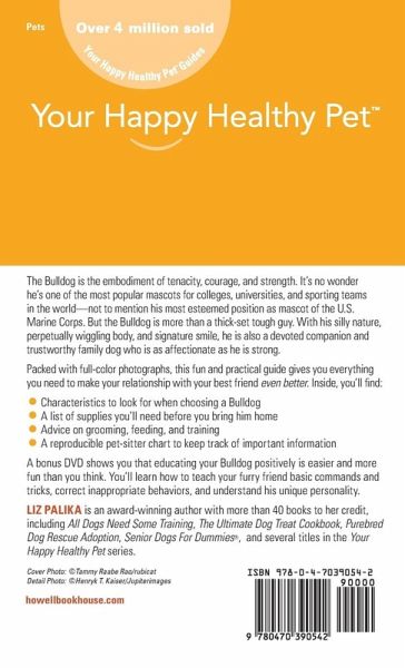 Your Happy Healthy Pet 30-minute training DVD contains bonus material specifically for your Bulldog! Dog behavioral trainer Peggy Moran shows you how properly training your Bulldog makes your best friend a Happy Healthy Pet for life. The Bulldog is the embodiment of tenacity, courage, and strength. It's no wonder he's one of the most popular mascots for colleges, universities, and sporting teams in the world--not to mention his most esteemed position as mascot of the U.S. Marine Corps. But the Bulldog is more than a thick-set tough guy. With his silly nature, perpetually wiggling body, and signature smile, he is also a devoted companion and trustworthy family dog who is as affectionate as he is strong. Packed with full-color photographs, this fun and practical guide gives you everything you need to make your relationship with your best friend even better. Inside, you'll find: Characteristics to look for when choosing a Bulldog A list of supplies you'll need before you bring him home Advice on grooming, feeding, and training A reproducible pet-sitter chart to keep track of important information A bonus DVD shows you that educating your Bulldog positively is easier and more fun than you think. You'll learn how to teach your furry friend basic commands and tricks, correct inappropriate behaviors, and understand his unique personality.