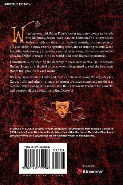 When ten-year-old Daiter Popski moves into a new house in Nevada with his family, he can't wait to see his bedroom. To his surprise, his bedroom walls are already painted with beautifully colored pictures of a giant forest, a sandy desert, a sparkling ocean, and an erupting volcano. When his father unknowingly gives him a special magic stone, the walls come to life, allowing Daiter to travel into new worlds and meet incredible creatures. Unfortunately, by opening the doorway to these new worlds, Daiter releases Bullen Gongo, an evil tribal sorcerer who is determined to steal the five magic stones that give life to each world. It's a race against time as Daiter and the friends he meets along the way-Nickel, Zardo, Bullf, and others-attempt to protect the magic stones and use them to capture Bullen Gongo. But can they stop Bullen before he becomes too powerful and destroys all the worlds, including Daiter's?