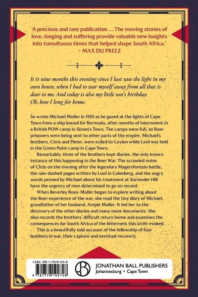 'A precious and rare publication ... The moving stories of love, longing and suffering provide valuable new insights into tumultuous times that helped shape South Africa.' - Max du Preez It is nine months this evening since I last saw the light in my own house, when I had to tear myself away from all that is dear to me. And today is also my little son's birthday. Oh, how I long for home. So wrote Michael Muller in 1901 as he gazed at the lights of Cape Town from a ship bound for Bermuda, after months of internment in a British POW camp in Simon's Town. The camps were full, so Boer prisoners were being sent to other parts of the empire. Michael's brothers, Chris and Pieter, were exiled to Ceylon while Lool was held in the Green Point camp in Cape Town. Remarkably, three of the brothers kept diaries, the only known instance of this happening in the Boer War. The scrawled notes of Chris on the evening after the legendary Magersfontein battle, the rain-dashed pages written by Lool in Colesberg, and the angry words penned by Michael about his treatment at Surrender Hill have the urgency of men determined to go on record. When Beverley Roos-Muller began to explore writing about the Boer experience of the war, she read the tiny diary of Michael, grandfather of her husband, Ampie Muller. It led her to the discovery of the other diaries and many more documents. She also records the brothers' difficult return home and examines the consequences for South Africa of the bitterness this strife evoked. This is a beautifully told account of the fellowship of four brothers in war, their capture and eventual recovery.