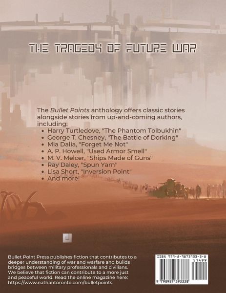 The Bullet Points anthology offers classic stories alongside stories from up-and-coming authors, including: Harry Turtledove, "The Phantom Tolbukhin"; George Tomkyns Chesney, "The Battle of Dorking"; Mia Dalia, "Forget Me Not"; A. P. Howell, "Used Armor Smell"; M. V. Melcer, "Ships Made of Guns"; and Marc A. Criley, "The Golden Rays of the Morning Sun." This is an anthology based on Bullet Points, an online military science fiction magazine. Bullet Point Press publishes fiction that contributes to a deeper understanding of war and warfare and builds bridges between military professionals and civilians. We believe that fiction can contribute to a more just and peaceful world. Read the magazine here: https://www.nathantoronto.com/bulletpoints. Submit to the magazine here: https://www.nathantoronto.com/bulletpoints/submissions.