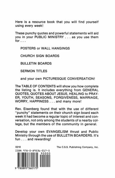 Here is a resource book that you will find yourself using every week! These punchy quotes and powerful statements will aid you in your public ministry... as you use them for... posters or wall hangings church sign boards bulletin boards sermon titles and your own picturesque conversation! The table of contents will show you how complete the listing is. It includes everything from general quotes, quotes about Jesus, healing to prayer, youth, seasons, forgiveness, marriage, worry, happiness... and many more! Rev. Eisenberg found that with the use of different "punchy" statements on their church sign board each week, it had become a regular topic of interest and conversation, not only among the students of a nearby college, but the members of the community in general. Develop your own evangelism thrust and public ministry through the use of Bulletin Boarder-ers. It's fun... and rewarding!