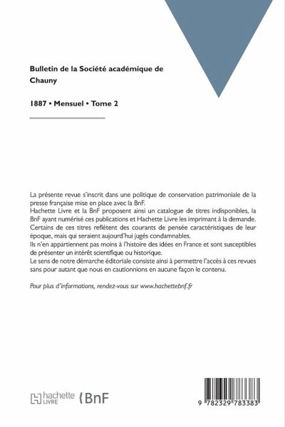 Bulletin de la Société académique de Chauny Date de l'édition originale: 1887 La présente revue s'inscrit dans une politique de conservation patrimoniale de la presse française mise en place avec la BnF. Hachette Livre et la BnF proposent ainsi un catalogue de titres indisponibles, la BnF ayant numérisé ces publications et Hachette Livre les imprimant à la demande. Certains de ces titres reflètent des courants de pensée caractéristiques de leur époque, mais qui seraient aujourd'hui jugés condamnables. Ils n'en appartiennent pas moins à l'histoire des idées en France et sont susceptibles de présenter un intérêt scientifique ou historique. Le sens de notre démarche éditoriale consiste ainsi à permettre l'accès à ces revues sans pour autant que nous en cautionnions en aucune façon le contenu. Pour plus d'informations, rendez-vous sur www.hachettebnf.fr