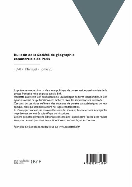 Bulletin de la Société de géographie commerciale de Paris Date de l'édition originale: 1898 La présente revue s'inscrit dans une politique de conservation patrimoniale de la presse française mise en place avec la BnF. Hachette Livre et la BnF proposent ainsi un catalogue de titres indisponibles, la BnF ayant numérisé ces publications et Hachette Livre les imprimant à la demande. Certains de ces titres reflètent des courants de pensée caractéristiques de leur époque, mais qui seraient aujourd'hui jugés condamnables. Ils n'en appartiennent pas moins à l'histoire des idées en France et sont susceptibles de présenter un intérêt scientifique ou historique. Le sens de notre démarche éditoriale consiste ainsi à permettre l'accès à ces revues sans pour autant que nous en cautionnions en aucune façon le contenu. Pour plus d'informations, rendez-vous sur www.hachettebnf.fr