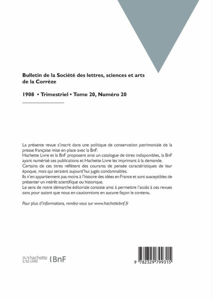 Bulletin de la Société des lettres, sciences et arts de la Corrèze Date de l'édition originale: 1908 La présente revue s'inscrit dans une politique de conservation patrimoniale de la presse française mise en place avec la BnF. Hachette Livre et la BnF proposent ainsi un catalogue de titres indisponibles, la BnF ayant numérisé ces publications et Hachette Livre les imprimant à la demande. Certains de ces titres reflètent des courants de pensée caractéristiques de leur époque, mais qui seraient aujourd'hui jugés condamnables. Ils n'en appartiennent pas moins à l'histoire des idées en France et sont susceptibles de présenter un intérêt scientifique ou historique. Le sens de notre démarche éditoriale consiste ainsi à permettre l'accès à ces revues sans pour autant que nous en cautionnions en aucune façon le contenu. Pour plus d'informations, rendez-vous sur www.hachettebnf.fr