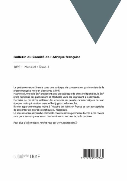 Bulletin du Comité de l'Afrique française Date de l'édition originale: 1893 La présente revue s'inscrit dans une politique de conservation patrimoniale de la presse française mise en place avec la BnF. Hachette Livre et la BnF proposent ainsi un catalogue de titres indisponibles, la BnF ayant numérisé ces publications et Hachette Livre les imprimant à la demande. Certains de ces titres reflètent des courants de pensée caractéristiques de leur époque, mais qui seraient aujourd'hui jugés condamnables. Ils n'en appartiennent pas moins à l'histoire des idées en France et sont susceptibles de présenter un intérêt scientifique ou historique. Le sens de notre démarche éditoriale consiste ainsi à permettre l'accès à ces revues sans pour autant que nous en cautionnions en aucune façon le contenu. Pour plus d'informations, rendez-vous sur www.hachettebnf.fr
