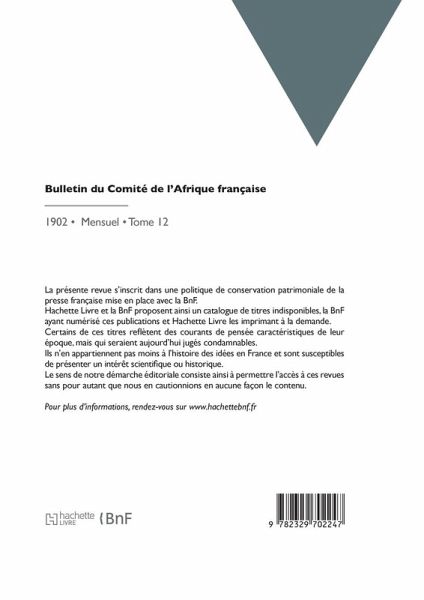 Bulletin du Comité de l'Afrique française Date de l'édition originale: 1902 La présente revue s'inscrit dans une politique de conservation patrimoniale de la presse française mise en place avec la BnF. Hachette Livre et la BnF proposent ainsi un catalogue de titres indisponibles, la BnF ayant numérisé ces publications et Hachette Livre les imprimant à la demande. Certains de ces titres reflètent des courants de pensée caractéristiques de leur époque, mais qui seraient aujourd'hui jugés condamnables. Ils n'en appartiennent pas moins à l'histoire des idées en France et sont susceptibles de présenter un intérêt scientifique ou historique. Le sens de notre démarche éditoriale consiste ainsi à permettre l'accès à ces revues sans pour autant que nous en cautionnions en aucune façon le contenu. Pour plus d'informations, rendez-vous sur www.hachettebnf.fr