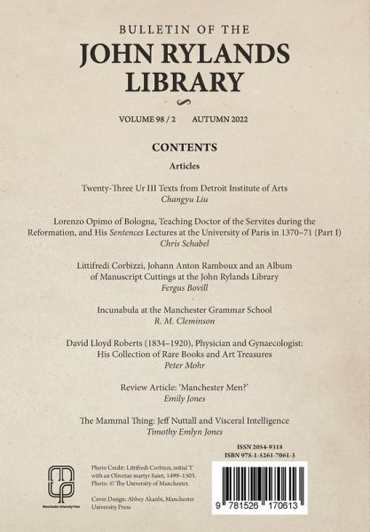 The Bulletin of the John Rylands Library is a long-running journal that publishes research complementary to the John Rylands Library's extensive special collections.