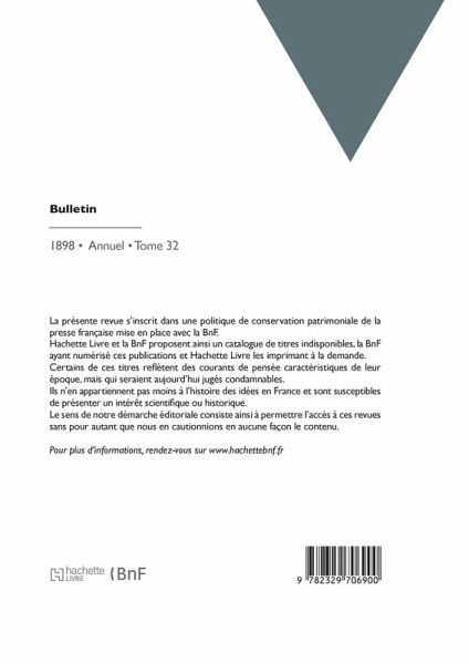 Bulletin / Société de protection des apprentis et des enfants des manufactures Date de l'édition originale: 1898 La présente revue s'inscrit dans une politique de conservation patrimoniale de la presse française mise en place avec la BnF. Hachette Livre et la BnF proposent ainsi un catalogue de titres indisponibles, la BnF ayant numérisé ces publications et Hachette Livre les imprimant à la demande. Certains de ces titres reflètent des courants de pensée caractéristiques de leur époque, mais qui seraient aujourd'hui jugés condamnables. Ils n'en appartiennent pas moins à l'histoire des idées en France et sont susceptibles de présenter un intérêt scientifique ou historique. Le sens de notre démarche éditoriale consiste ainsi à permettre l'accès à ces revues sans pour autant que nous en cautionnions en aucune façon le contenu. Pour plus d'informations, rendez-vous sur www.hachettebnf.fr