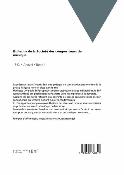 Bulletins de la Société des compositeurs de musique Date de l'édition originale: 1863 La présente revue s'inscrit dans une politique de conservation patrimoniale de la presse française mise en place avec la BnF. Hachette Livre et la BnF proposent ainsi un catalogue de titres indisponibles, la BnF ayant numérisé ces publications et Hachette Livre les imprimant à la demande. Certains de ces titres reflètent des courants de pensée caractéristiques de leur époque, mais qui seraient aujourd'hui jugés condamnables. Ils n'en appartiennent pas moins à l'histoire des idées en France et sont susceptibles de présenter un intérêt scientifique ou historique. Le sens de notre démarche éditoriale consiste ainsi à permettre l'accès à ces revues sans pour autant que nous en cautionnions en aucune façon le contenu. Pour plus d'informations, rendez-vous sur www.hachettebnf.fr