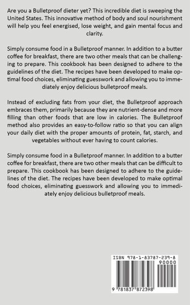 Are you a Bulletproof dieter yet? This incredible diet is sweeping the United States. This innovative method of body and soul nourishment will help you feel energised, lose weight, and gain mental focus and clarity. Simply consume food in a Bulletproof manner. In addition to a butter coffee for breakfast, there are two other meals that can be challenging to prepare. This cookbook has been designed to adhere to the guidelines of the diet. The recipes have been developed to make optimal food choices, eliminating guesswork and allowing you to immediately enjoy delicious bulletproof meals. Instead of excluding fats from your diet, the Bulletproof approach embraces them, primarily because they are nutrient-dense and more filling than other foods that are low in calories. The Bulletproof method also provides an easy-to-follow ratio so that you can align your daily diet with the proper amounts of protein, fat, starch, and vegetables without ever having to count calories. Simply consume food in a Bulletproof manner. In addition to a butter coffee for breakfast, there are two other meals that can be difficult to prepare. This cookbook has been designed to adhere to the guidelines of the diet. The recipes have been developed to make optimal food choices, eliminating guesswork and allowing you to immediately enjoy delicious bulletproof meals.