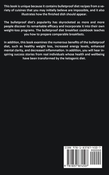 This book is unique because it contains bulletproof diet recipes from a variety of cuisines that you may initially believe are impossible, and it also illustrates how the finished dish should appear. The bulletproof diet's popularity has skyrocketed as more and more people discover its remarkable efficacy and incorporate it into their own weight-loss programs. The bulletproof diet breakfast cookbook teaches you how to prepare comparable breakfasts. In addition, this book examines the numerous benefits of the bulletproof diet, such as healthy weight loss, increased energy levels, enhanced mental clarity, and decreased inflammation. In addition, you will hear inspiring success stories from real individuals whose health and wellbeing have been transformed by the ketogenic diet.