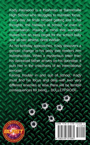 Kody Haywood is a freshman at Bannerville High School who struggles to maintain focus. Every day he finds himself getting lost in his thoughts, the hallways at school, or even in conversation. Having a mind that wanders makes him an easy target for the school bully (and all-star athlete), Brett Walker. But as his birthday approaches, Kody discovers a genetic change in his body renders him indestructible. When a mysterious letter from his deceased father arrives on his doorstep, it puts him in the crosshairs of an international terrorist! Facing trouble in and out of school, Kody must find his focus and deal with two very different enemies, or else there will be terrible consequences for being...BULLETPROOF!