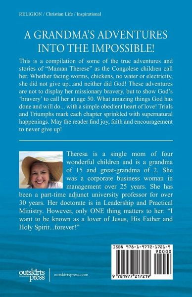 This is a true story of a single mother of four children and grandma of 15 grandchildren, who dared at age 50 to obey the Voice of the Lord and leading of Holy Spirit to sell her home, leave her teaching career to move across the globe to rescue street children, help widows and to show the Love of God in action to a poor people who have known so much war and defeat. Showing up in a time of government transition in Congo and much ongoing unrest, Theresa's life was an encouragement and inspiration to all she met and helped. She hopes to be an inspiration to her readers as well. God is a real person who loves His children as a Father and wants us to know well the personality of His Son Jesus. Life offers many challenges, problems and evils to overcome. However, Holy Spirit was sent to bring about great miracles and victories in the midst of each trial and storm. This simple compilation of deeply moving and inspirational stories will impart faith, courage and a deeper love for God in each reader's own daily relationship. If you don't believe in God yet this will give the reader fresh hope. Enjoy the journey!