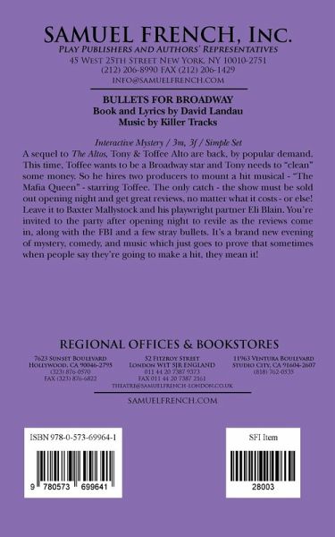Book & Lyrics by David Landau, Music by Killer TracksInteractive MysteryCharacters: 3 male, 3 femaleA sequel to The Altos, Tony & Toffee Alto are back, by popular demand. This time, Toffee wants to be a Broadway star and Tony needs to "clean" some money. So he hires two producers to mount a hit musical - "The Mafia Queen" - starring Toffee. The only catch - the show must be sold out opening night and get