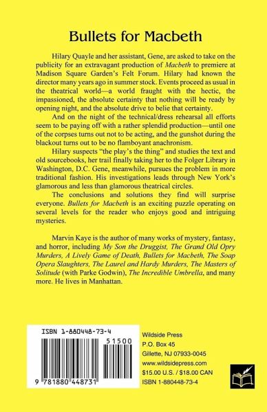 Hilary Quayle and her assistant, Gene, are asked to take on the publicity for an extravagant production of Macbeth to premiere at Madison Square Garden's Felt Forum. Hilary had known the director many years ago in summer stock. Events proceed as usual in the theatrical world -- a world fraught with the hectic, the impassioned, the absolute certainty that nothing will be ready by opening night, and the absolute drive to belie that certainty. And on the night of the technical/dress rehearsal all efforts seem to be paying off with a rather splendid production -- until one of the corpses turns out not to be acting, and the gunshot during the blackout turns out to be no flamboyant anachronism. Hilary suspects "the play's the thing" and studies the text and old sourcebooks, her trail finally taking her to the Folger Library in Washington, D.C. Gene, meanwhile, pursues the problem in more traditional fashion. His investigations leads through New York's glamorous and less than glamorous theatrical circles. The conclusions and solutions they find will surprise everyone. Bullets for Macbeth is an exciting puzzle operating on several levels for the reader who enjoys good and intriguing mysteries.