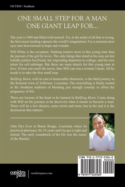 The year is 1969 and filled with turmoil. Yet, in the midst of all that is wrong, the first moon landing captures the world's imagination. For a moment most eyes turn heavenward in hope and wonder. But not Will's. Nothing matters more to this young man than the pursuit of the girl he loves. The only things that stand in his way are her lethally jealous boyfriend, her impending departure to college, and his own talent for self-sabotage. But these are mere details for this young man in love. If men can reach the moon, then Will can win a woman's heart. All he needs is to take the first small step. Bullfrog Moon with its cast of memorable characters is the third in a trilogy collectively known as The Jefferson Tales. As does Better To Be Vile and The Book of James, the storytelling is firmly rooted in the Southern tradition of blending just enough comedy to offset the poignancy of life. There are lessons of the heart to be learned in Bullfrog Moon. Come along with Will on his journey as he discovers what it means to become a man. There will be a few detours, some twists and turns, but in the end it is the destination that matters.