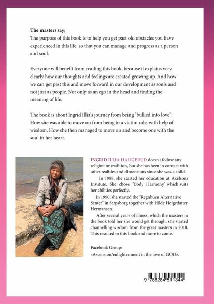The masters say;The purpose of this book is to help you get past old obstacles you have experienced in this life, so that you can manage and progress as a person and soul.Everyone will benefit from reading this book, because it explains very clearly how our thoughts and feelings are created growing up. And how we can get past this and move forward in our development as souls and not just as people. Not only as an ego in the head and finding the meaning of life.The book is about Ingrid Illia's journey from being "bullied into love".How she was able to move on from being in a victim role, with help of wisdom. How she then managed to move on and become one with the soul in her heart.
