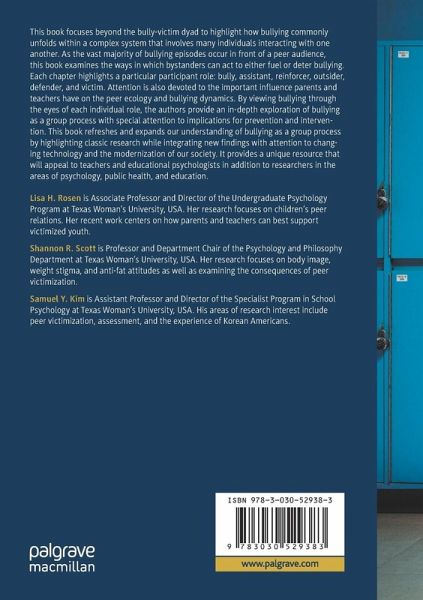 This book focuses beyond the bully-victim dyad to highlight how bullying commonly unfolds within a complex system that involves many individuals interacting with one another. As the vast majority of bullying episodes occur in front of a peer audience, this book examines the ways in which bystanders can act to either fuel or deter bullying. Each chapter highlights a particular participant role: bully, assistant, reinforcer, outsider, defender, and victim. Attention is also devoted to the important influence parents and teachers have on the peer ecology and bullying dynamics. By viewing bullying through the eyes of each individual role, the authors provide an in-depth exploration of bullying as a group process with special attention to implications for prevention and intervention. This book refreshes and expands our understanding of bullying as a group process by highlighting classic research while integrating new findings with attention to changing technology and the modernization of our society. It provides a unique resource that will appeal to teachers and educational psychologists in addition to researchers in the areas of psychology, public health, and education.