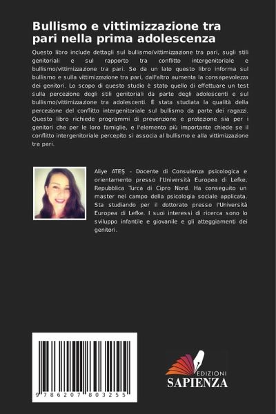 Questo libro include dettagli sul bullismo/vittimizzazione tra pari, sugli stili genitoriali e sul rapporto tra conflitto intergenitoriale e bullismo/vittimizzazione tra pari. Se da un lato questo libro informa sul bullismo e sulla vittimizzazione tra pari, dall'altro aumenta la consapevolezza dei genitori. Lo scopo di questo studio è stato quello di effettuare un test sulla percezione degli stili genitoriali da parte degli adolescenti e sul bullismo/vittimizzazione tra adolescenti. È stata studiata la qualità della percezione del conflitto intergenitoriale sul bullismo da parte dei ragazzi. Questo libro richiede programmi di prevenzione e protezione sia per i genitori che per le loro famiglie, e l'elemento più importante chiede se il conflitto intergenitoriale percepito si associa al bullismo e alla vittimizzazione tra pari.