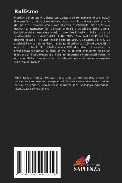 Il bullismo è un tipo di violenza caratterizzata da comportamenti premeditati di abuso fisico, psicologico e verbale, che uno studente riceve ripetutamente da uno o più studenti, con l'unico obiettivo di intimidirlo, discriminarlo o escluderlo, attentando così all'integrità fisica e psicologica della vittima. L'obiettivo della ricerca era quello di scoprire il livello di bullismo tra gli studenti della sesta classe dell'I.E.P. Nº 72005 - "San Martin de Porres" del distretto di Asillo. I risultati indicano che sul 100% (38 studenti), il 73% (28 studenti) ha mostrato un livello moderato di bullismo, il 15% (6 studenti) ha mostrato un livello alto di bullismo e il 10% (4 studenti) ha mostrato un livello basso di bullismo. Si conclude che: gli studenti della prima media "A" mostrano un livello moderato di bullismo, in quanto gli intervistati mostrano un certo rifiuto di andare a scuola, oltre ad avere conseguenze negative sulla loro personalità.