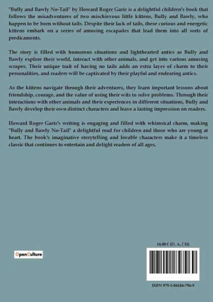 "Bully and Bawly No-Tail" by Howard Roger Garis is a delightful children's book that follows the misadventures of two mischievous little kittens, Bully and Bawly, who happen to be born without tails. Despite their lack of tails, these curious and energetic kittens embark on a series of amusing escapades that lead them into all sorts of predicaments. The story is filled with humorous situations and lighthearted antics as Bully and Bawly explore their world, interact with other animals, and get into various amusing scrapes. Their unique trait of having no tails adds an extra layer of charm to their personalities, and readers will be captivated by their playful and endearing antics. As the kittens navigate through their adventures, they learn important lessons about friendship, courage, and the value of using their wits to solve problems. Through their interactions with other animals and their experiences in different situations, Bully and Bawly develop their own distinct characters and leave a lasting impression on readers. Howard Roger Garis's writing is engaging and filled with whimsical charm, making "Bully and Bawly No-Tail" a delightful read for children and those who are young at heart. The book's imaginative storytelling and lovable characters make it a timeless classic that continues to entertain and delight readers of all ages.