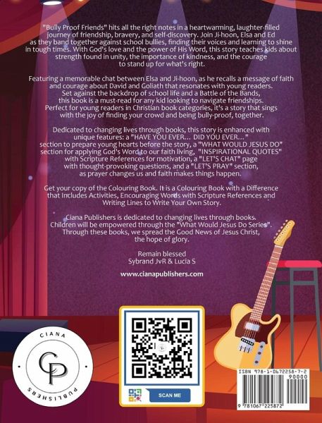 "The Adventures of Ji-hoon and Elsa" Book 2 hits all the right notes in a heartwarming, laughter-filled journey of friendship, bravery, and self-discovery. Join Ji-hoon, Elsa and Ed as they band together against school bullies, finding their voices and learning to shine in tough times. With God's love and the power of His Word, this story teaches kids about strength found in unity, the importance of unity, kindness, and the courage to stand up for what's right. Featuring a memorable chat between Elsa and Ji-hoon, as he recalls a message of faith and courage about David and Goliath that resonates with young readers. Set against the backdrop of school life and a Battle of the Bands, this book is a must-read for any kid looking to navigate friendships. Perfect for young readers in Christian book categories, it's a story that sings with the joy of finding your crowd and being bully-proof, together. Dedicated to changing lives through books, this story is enhanced with unique features: a "HAVE YOU EVER... DID YOU EVER..." section to prepare young hearts before the story, a "WHAT WOULD JESUS DO" section for applying God's Word to our faith living, "INSPIRATIONAL QUOTES" with Scripture References for motivation, a "LET'S CHAT" page with thought-provoking questions, and a "LET'S PRAY" section, as prayer changes us and faith makes things happen. Get your copy of the Colouring Book. It is a Colouring Book with a Difference that Includes Activities, Encouraging Words with Scripture References and Writing Lines to Write Your Own Story. Ciana Publishers is dedicated to changing lives through books. Children will be empowered through the "What Would Jesus Do Series". Through these books, we spread the Good News of Jesus Christ, the hope of glory. Remain blessed. Sybrand JvR & Lucia S
