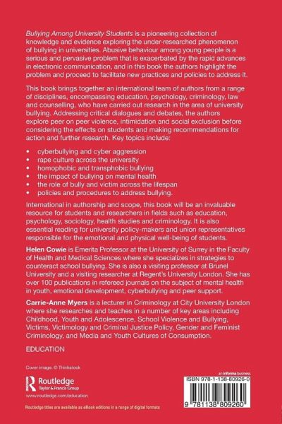 Bullying Amongst University Students is a pioneering collection of knowledge and evidence exploring the under-researched phenomenon of bullying in universities. Abusive behaviour amongst young people is a serious and pervasive problem that is exacerbated by the rapid advances in electronic communication, and in this book the authors highlight the problem and proceed to facilitate new practices and policies to address it. This book brings together an international team of authors from a range of disciplines, encompassing education, psychology, criminology, law and counselling, who have carried…mehr