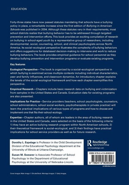 Bullying in North American Schools is an exciting compilation of research on bullying in school-aged youth by a representative group of researchers, including developmental, social, counseling, school, and clinical psychologists across North America. This new edition: illustrates the complexity of bullying behaviors and offers suggestions for decision-making to intervene and work to reduce bullying behaviors provides empirical guidance for school personnel as they develop bullying prevention and intervention programs or evaluate existing programs uses a social-ecological perspective in which bullying is examined across multiple contexts including individual characteristics, peer and family influences, and classroom dynamics includes basic research data from leaders in the field of bullying and victimization in the United States and Canada teaches practical implications of various types of programs and how to choose and implement one that fits their school ecology. This text will help your students understand how to prevent bullying behavior and how to select and manage intervention efforts in schools and school districts.